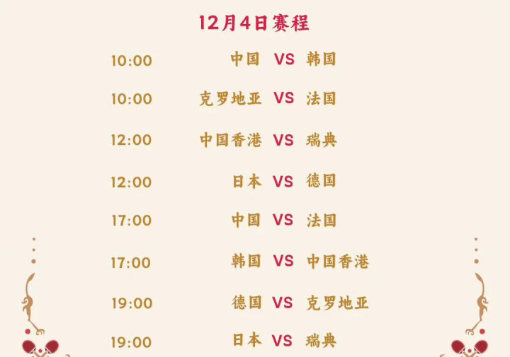 北京时间12月4日讯,2025混团世界杯八强循环赛进入关键节点。首轮国乒、日本、韩国、德国取胜,暂列前四。今天开始一日双赛,强强碰撞将全面揭示四强格局。国乒将在今天迎来最严峻的两场硬仗,对手分别是韩国和法国,两场比赛都由CCTV5直播。